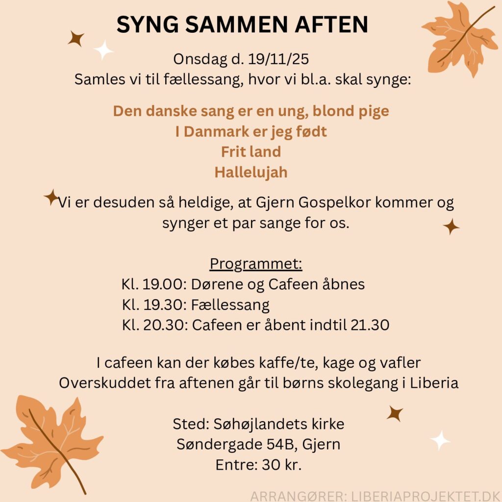 Onsdag 11. november kl. 19 til 21.30 gentager vi sidste års store succes med en syng sammen- og koncertaften til fordel for Liberiaprojektet. Dygtige lokale musikere og sangere vil synge med og for os, og vi får besøg af Gjern Gospelkor. Entre 30 kr. I cafeen kan der hygges og købes kaffe, te m.m. til at smøre stemmebåndene med. Kom og syng med!